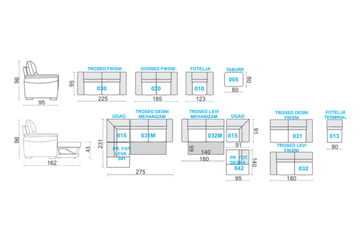 Postoji mogućnost kupovine zasebnih elemenata, kao i kombinacije boja, dezena i materijala. Veoma udobna, sedeći deo urađen od poliuretanske pene koja povećava osećaj udobnosti. Drvena konstrukcija omogućava čvrstoću i dugotrajnost, a drveni nogari mogućnost odabira boja.