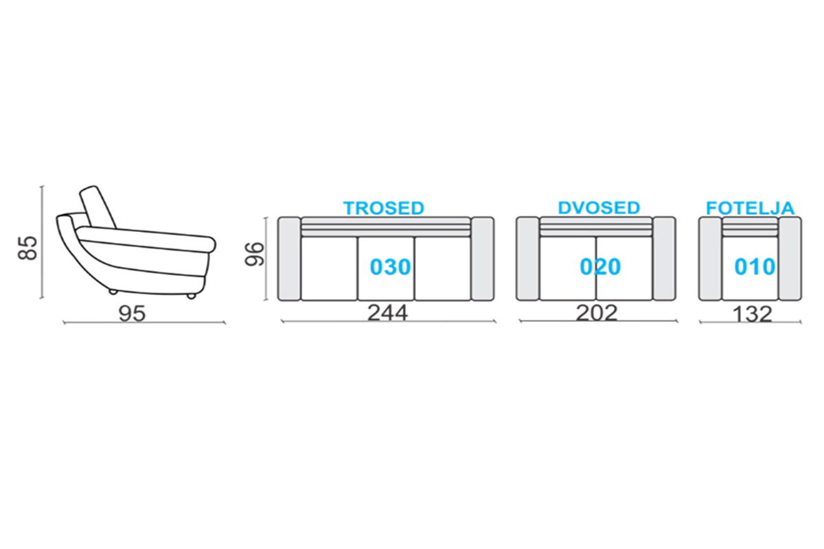 Garnitura modernog dizajna, sa metalnim nogarima. Sastoji se iz kompleta trosed, dvosed i fotelja.